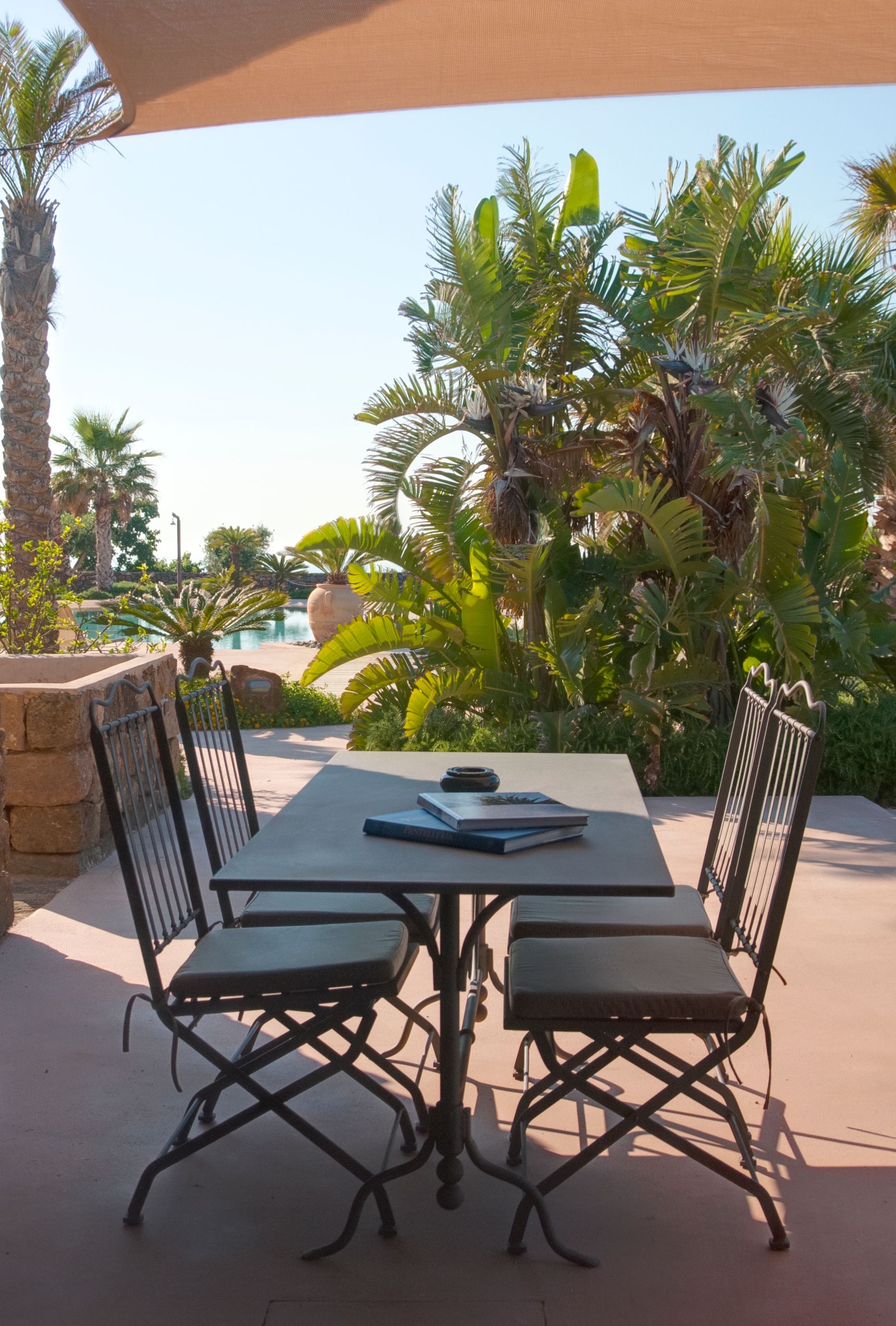 All’esterno, il dammuso si apre su un patio privato arredato con tavolo e poltroncine, immerso nel verde del giardino mediterraneo.