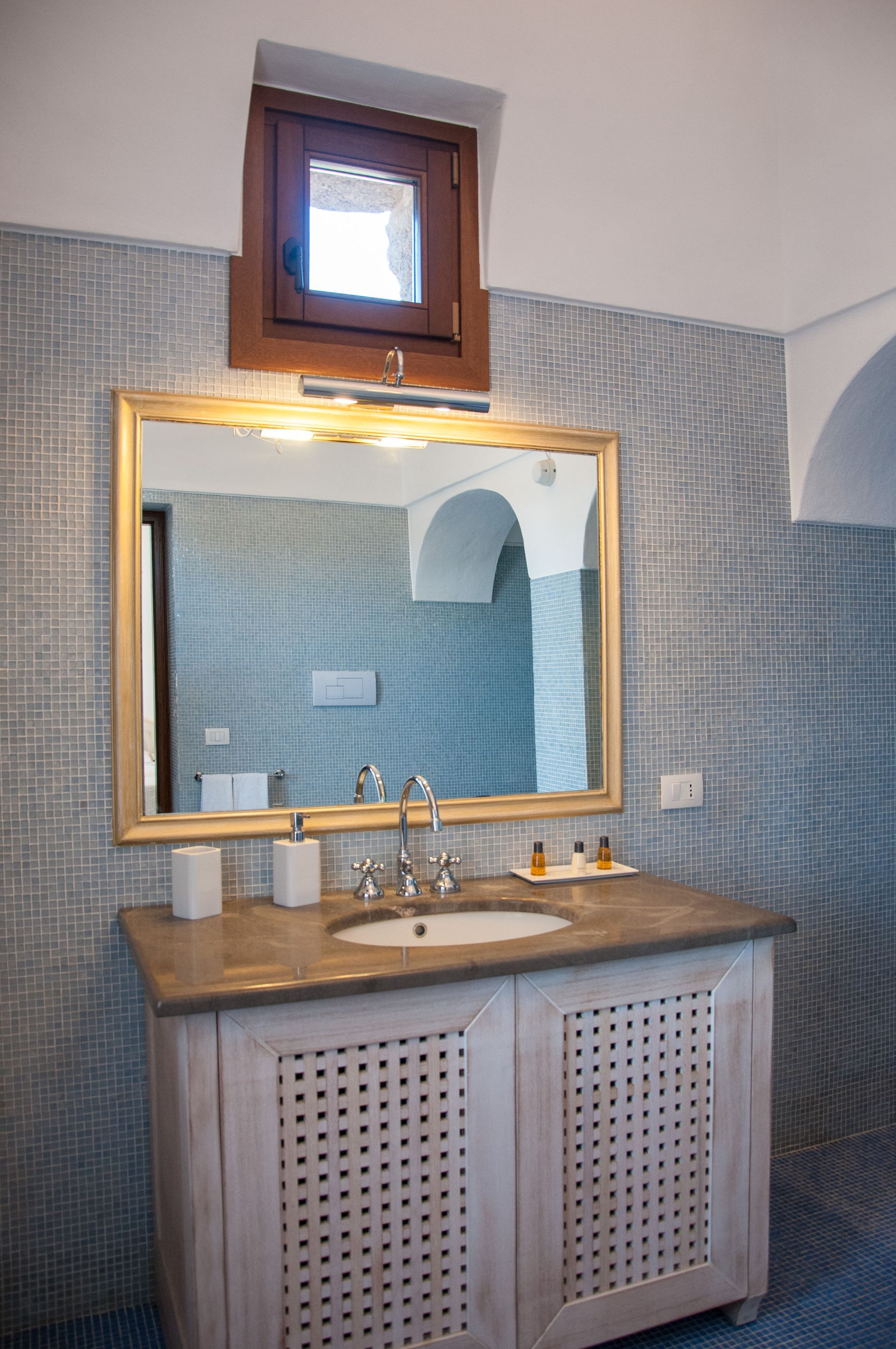 - Un bagno con doccia e una scenografica vasca artigianale rivestita in mosaico, perfetta per momenti di relax